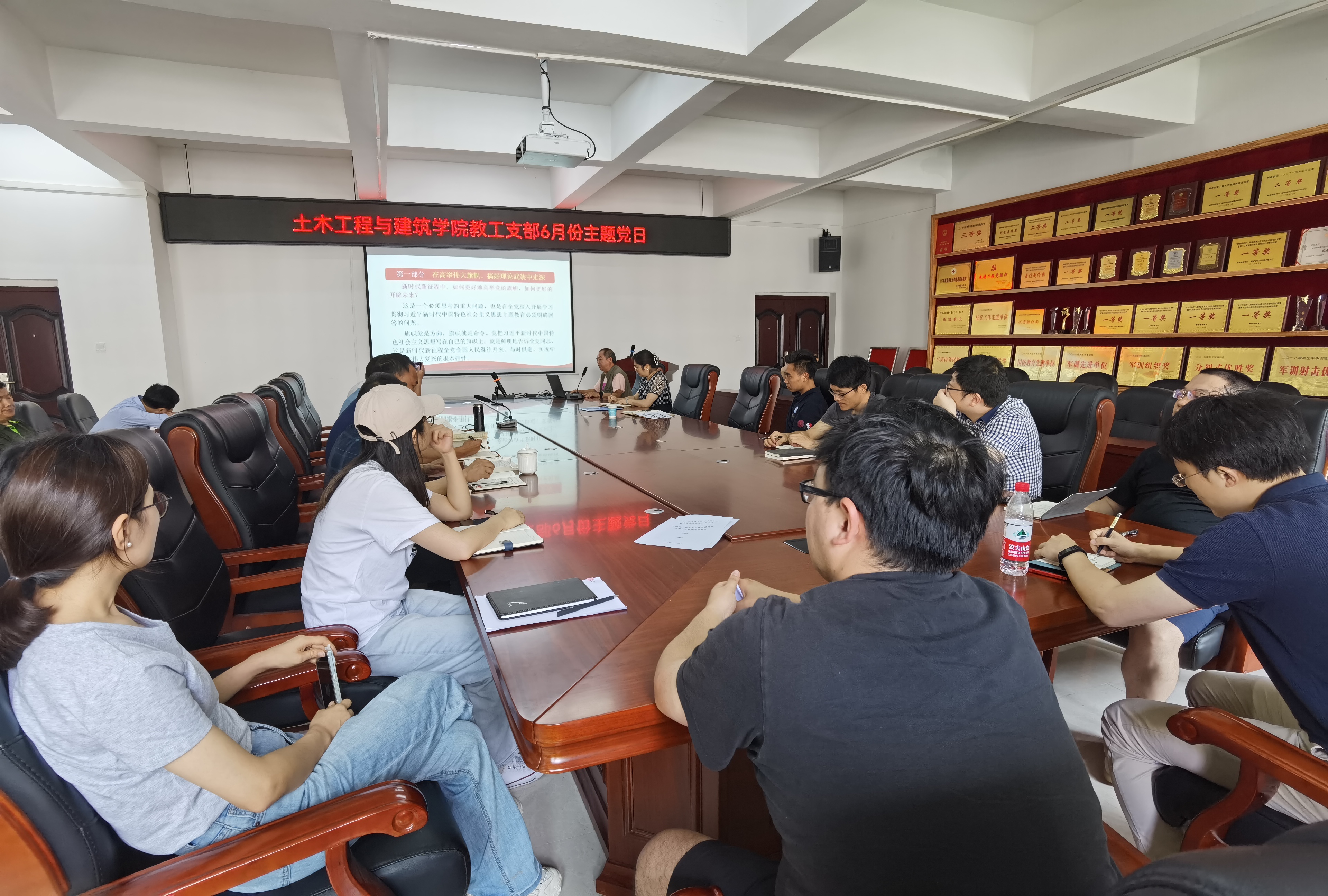 2023年6月20日,土木工程与建筑学院教工党支部在学院会议室开展了 “深入学习贯彻习近平新时代中国特色社会主义思想”主题党日活动。会议由教工党支部书记彭艳同志主持,院党委委员、学院领导班子及全体教工党员参加了会议。