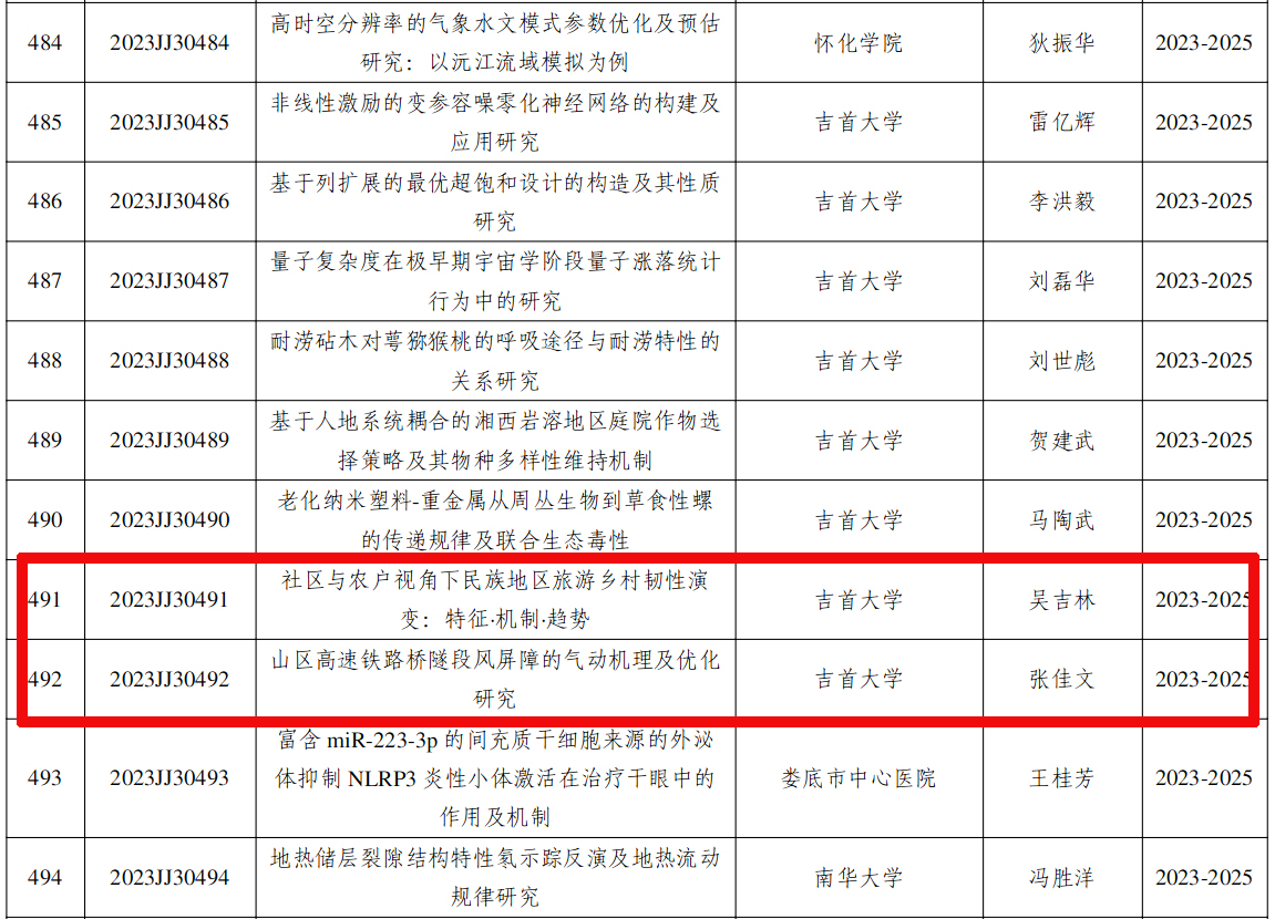 近日,湖南省自然科学基金委员会发布《2023年度湖南省自然科学基金项目实施目标、实施时间及立项名单》,我院吴吉林教授申报的“社区与农户视角下民族地区旅游乡村韧性演变:特征·机制·趋势”,张佳文博士申报的“山区高速铁路桥隧段风屏障的气动机理及优化研究”获批立项。