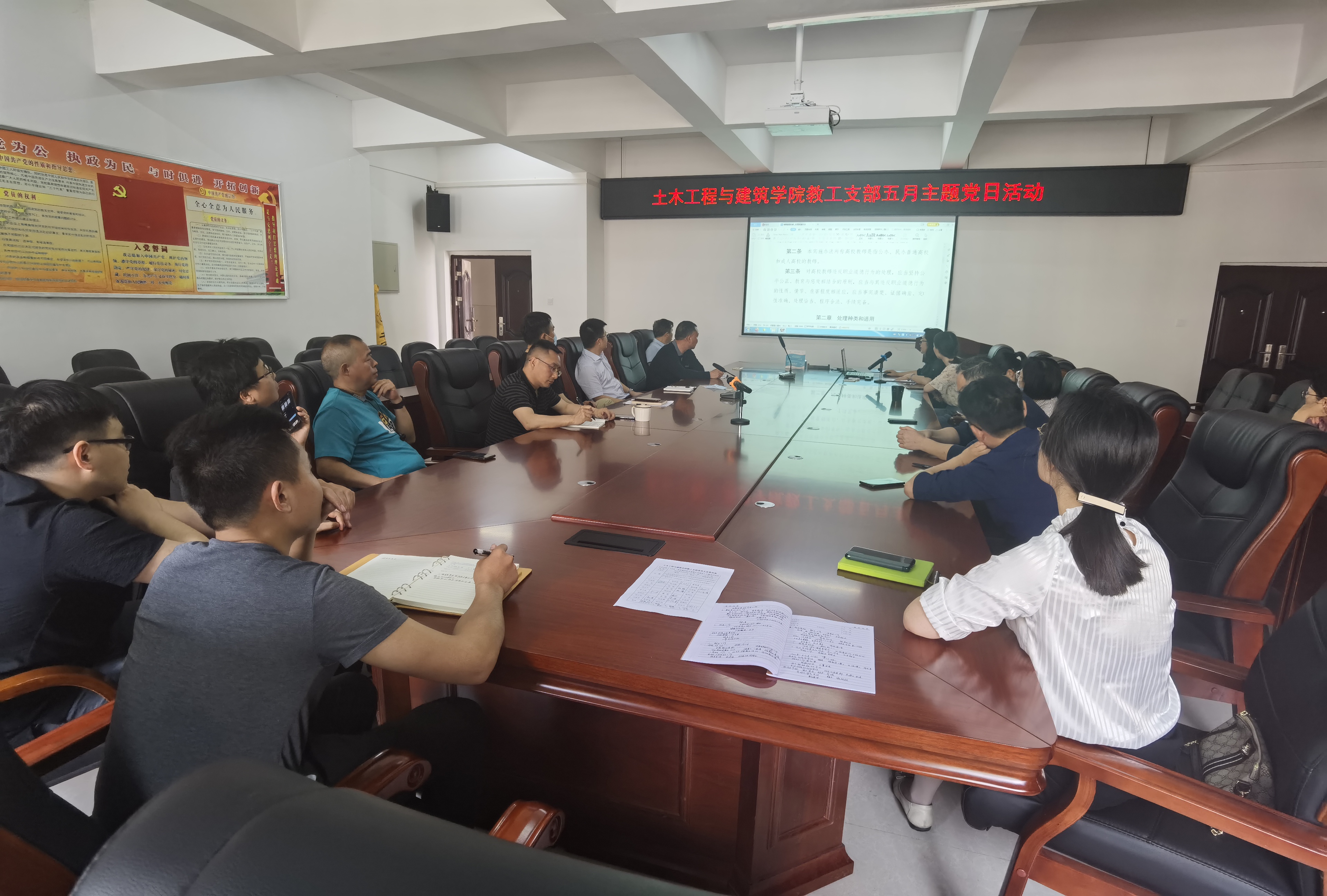2022年5月24日,“土木工程与建筑学院教工党支部五月职业道德教育主题党日活动”在学院会议室进行。活动由教工党支部书记彭艳同志主持,院党委书记王文广、院长吴吉林等全体教工党员参加了活动。
