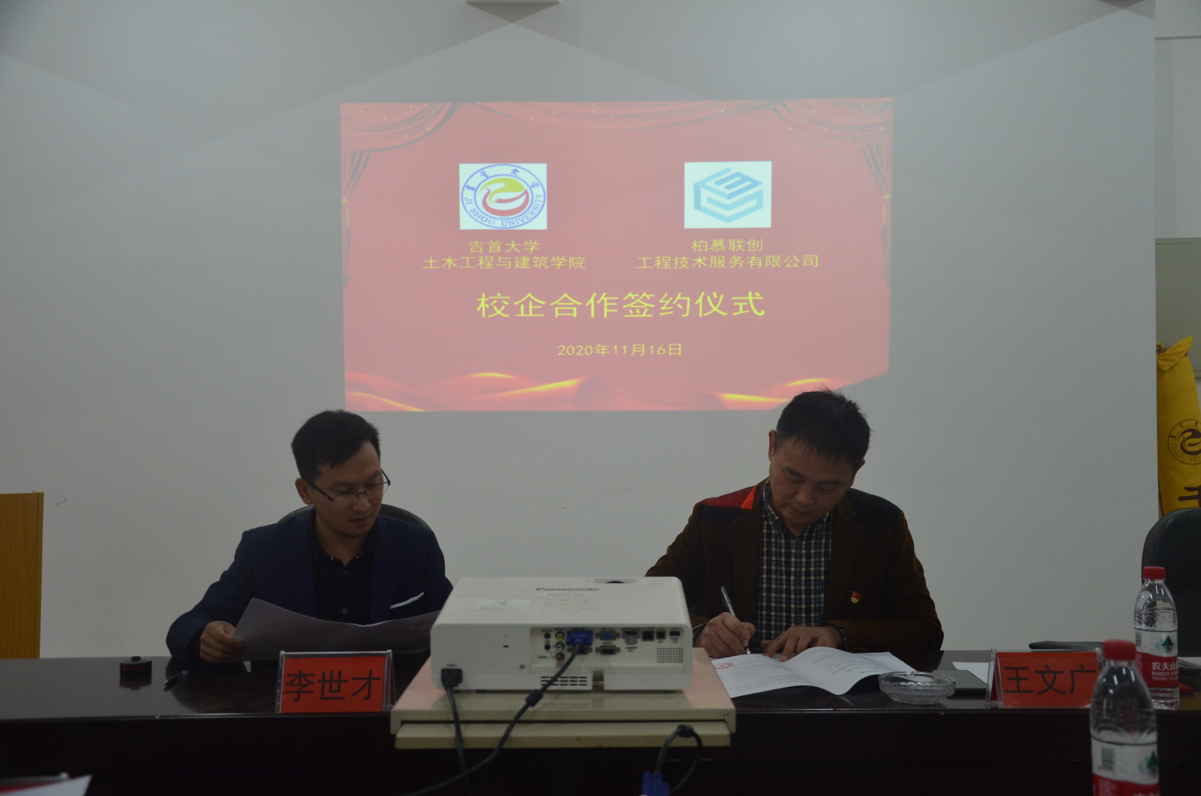 图为 学院王文广书记与柏慕联创总经理李世才签订合作协议 |