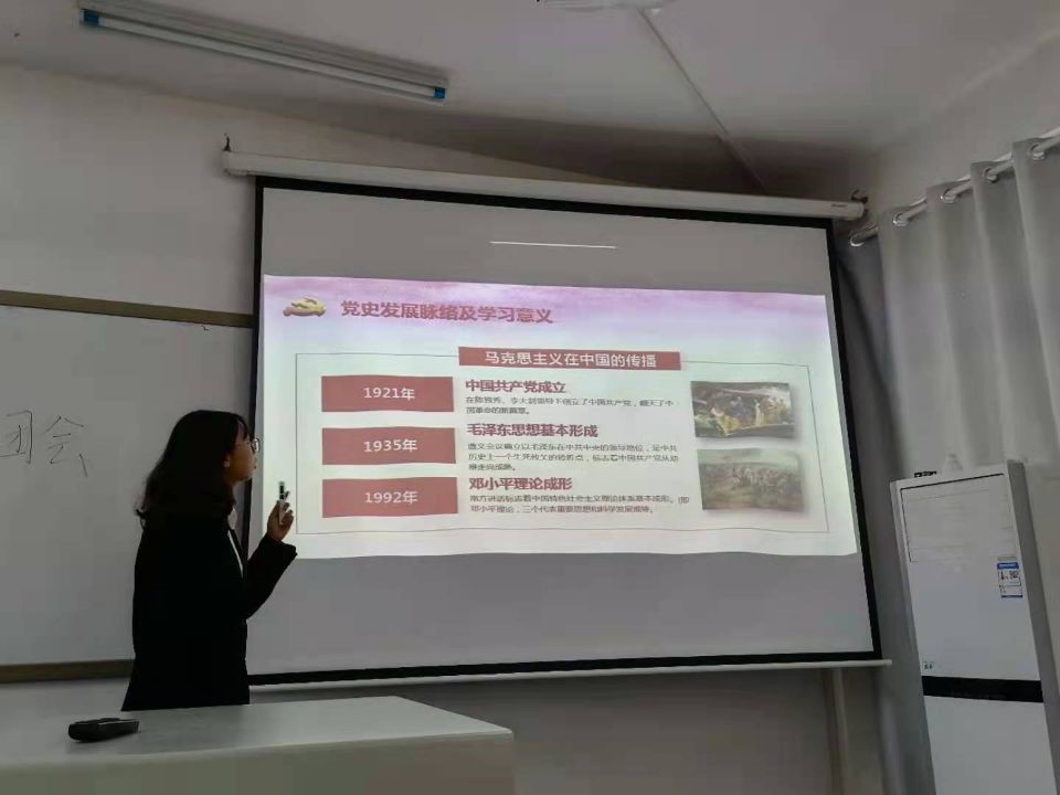 本次团会围绕党史故事.我来说、党史知识.对你讲、中国党史.我们学三个部分展开。主持人钟颖从中国共产党诞生初期、抗日战争和解放战争时期、向社会主义过渡及建设时期、现代建设时期四个时期依次进行讲解,会议过程中,全体团支书认真学习,仔细思考,团会气氛活跃。